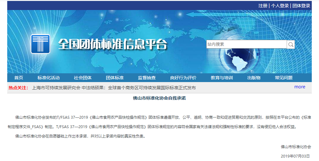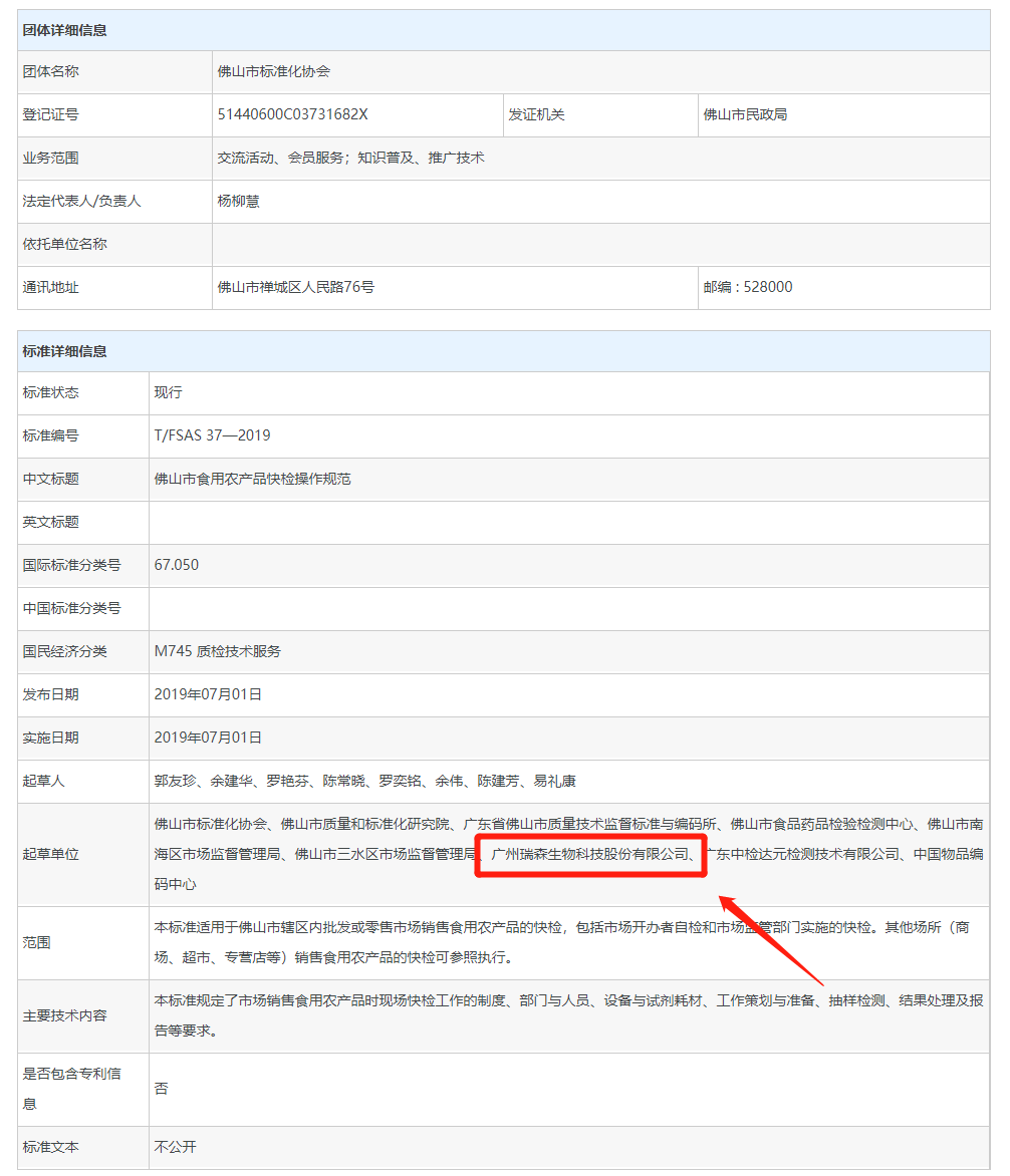瑞森生物参与制定的T/FSAS 37—2019《佛山市食用农产品快检操作规范》团体标准于2019年7月1日在全国团体标准信息平台发布公示。