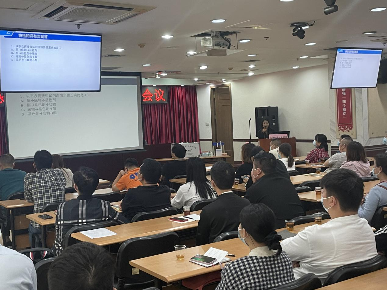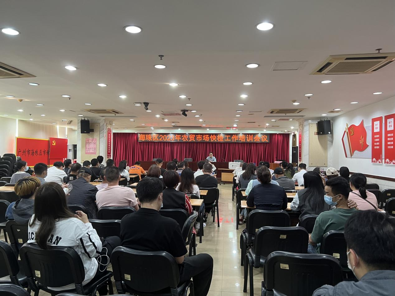 为进一步提高各农贸市场快速检测人员的理论和实操水平,同时提升快检服务机构的服务质量,使两者有效衔接,确保海珠区食用农产品质量安全。广州市海珠区市场监督管理局于2023年3月16日举办了“海珠区2023年农贸市场快检工作培训会议”。广州市海珠区市场监督管理局、广州市食品检验所、广州检验检测认证集团有限公司、安博体育登录官网等单位领导、同事以及海珠区各市场监管所负责食品安全监管工作的人员代表、海珠区快速检测服务机构工作人员代表、海珠区各农贸市场(超市)参与食用农产品快速检测的人员代表参与了此次培训会议。
