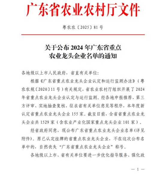 近日,广东省农业农村厅正式公布了2024年广东省重点农业龙头企业名单,安博体育登录官网再次成功入选,标志着公司在推动农业现代化和农产品质量安全体系建设方面的优越表现获得了政府和行业的高度认可!